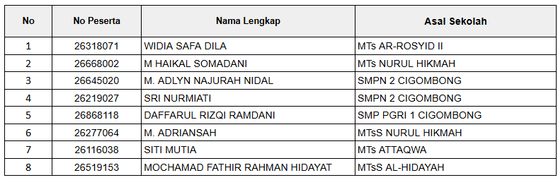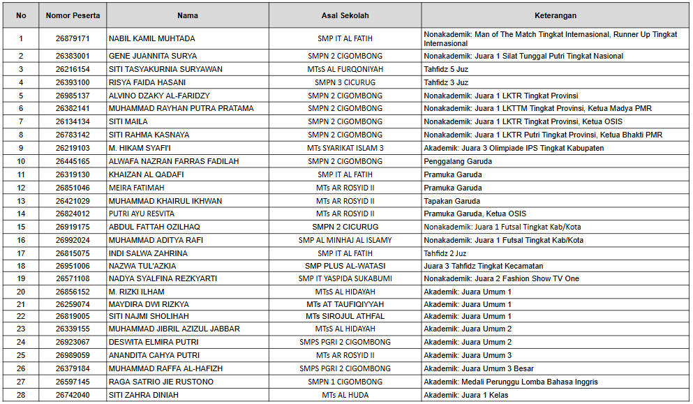 Berdasarkan Surat Keputusan Nomor: 0633/Ma.10.04/PP.00.6/04/2026 tentang Penetapan Penerimaan Murid Baru Madrasah (PMBM) Jalur Prestasi dan Afirmasi Tahun Pelajaran 2026/2027, dengan ini disampaikan bahwa nama-nama calon peserta didik berikut DINYATAKAN LULUS SELEKSI dan diterima sebagai peserta didik baru MAN 4 Bogor Tahun Pelajaran 2026/2027.