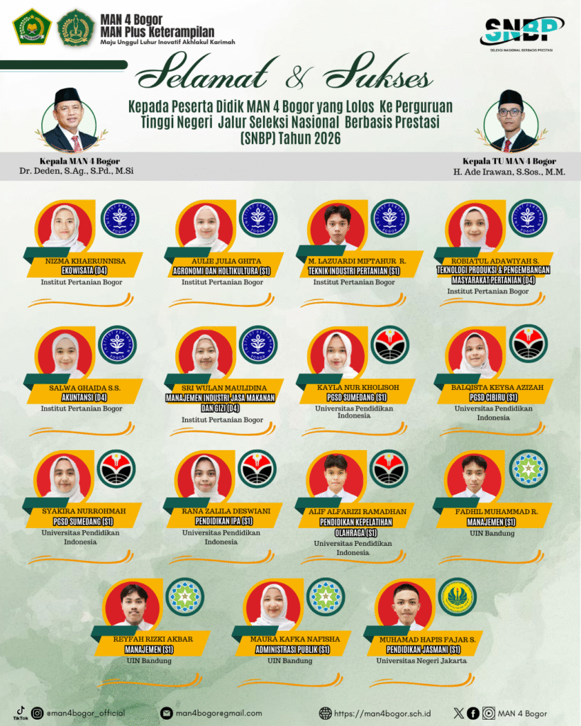 Keberhasilan ini merupakan hasil dari kerja keras peserta didik, dukungan orang tua, serta bimbingan dari para guru dalam proses pembelajaran dan pendampingan akademik. Jalur SNBP yang menitikberatkan pada prestasi akademik dan konsistensi belajar menjadi bukti bahwa peserta didik MAN 4 Bogor mampu bersaing di tingkat nasional.